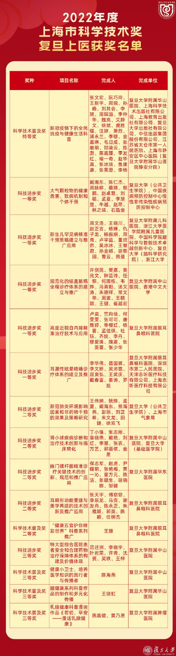 2022年度上海市科学技术奖励大会今日召开,复旦上医作为第一完成单位获奖15项(人)。其中,华山医院感染科主任、国家传染病医学中心主任张文宏领衔完成的项目“新冠疫情下的全民抗疫与健康生活科普”荣获上海市科学技术普及奖特等奖。