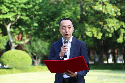 上午7时,主持人宣布升旗仪式正式开始。2021级本科生罗新强、2020级本科生王耕宇、文一帆、赵佳祎、姜文丽等五位旗手整齐划一的步伐打破寂静晨曦,在庄严肃穆的国歌声中,在全体师生的注目下,五星红旗冉冉升起。接下来教师代表高跃教授、学生代表崔晨昊同学、校友代表唐红斌先生先后发言。