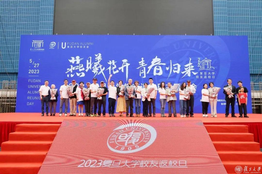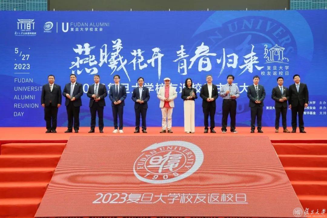 校党委书记裘新,校长、复旦大学校友会会长金力向在不同方面助力母校发展的校友代表颁发纪念奖杯。2013届计算机学院校友,达观数据联合创始人纪传俊和唐红斌校友代表计算机学院获此殊荣。