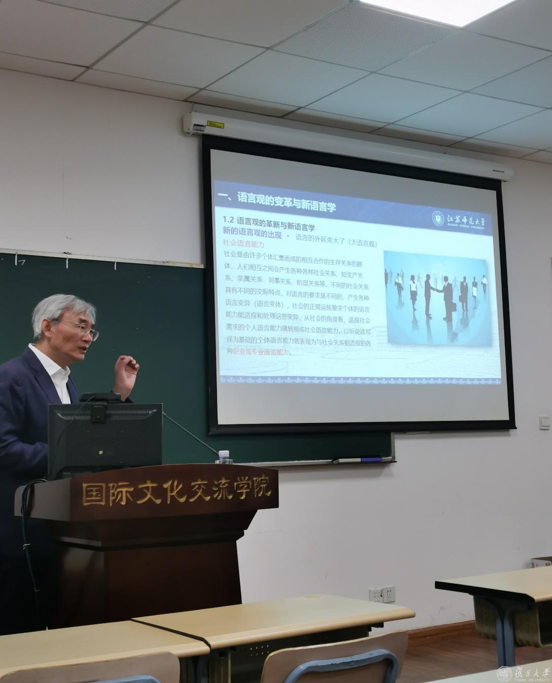 6月13日下午,著名语言学家、江苏师范大学语言科学与艺术学院院长杨亦鸣做客国际文化交流学院“望道语言文化讲坛”,为学院师生作题为“语言观的变革与语言学的新发展”的学术报告。报告会由学院副院长吴剑锋主持,学院部分老师及相关专业研究生参加了本次报告会。