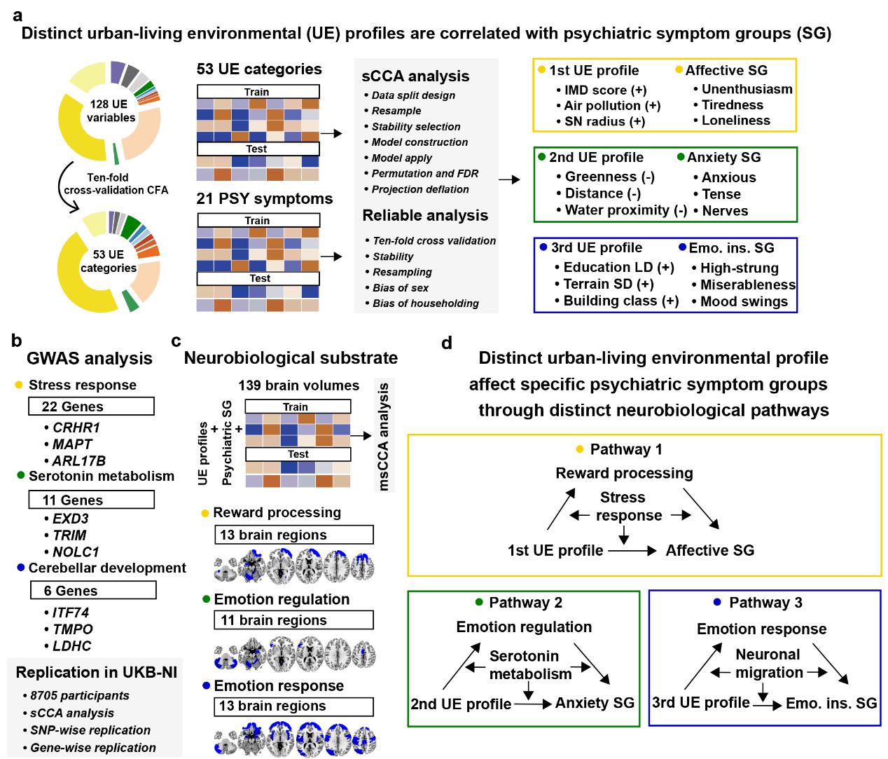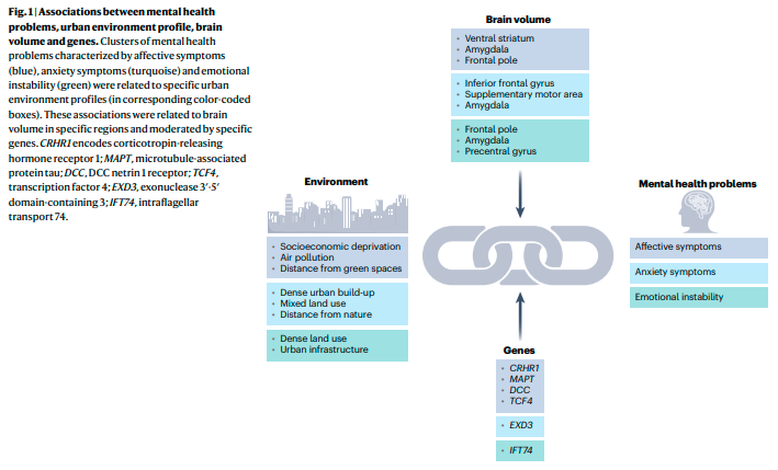 该研究团队使用来自英国生物数据库(UK Biobank)的15万名参与者的环境和精神健康数据,经过内部数据和外部数据的多重验证,通过进行(多元)稀疏典型相关分析,构建城市环境与情绪障碍症状之间的模块化关联。研究发现第一类城市环境模块,包括社会剥夺、空气和噪音污染、街道网络和城市土地利用密度等指标,主要通过影响奖赏系统相关脑区的体积(如腹侧纹状体),引起不同的情绪症状群(例如孤独、抑郁)。此外,暴露于相同的城市环境模块的被试,并不会引起统一的情绪症状反应,而是表现出个体差异,其中遗传变异是一个重要来源。通过对城市环境与情绪症状模块化关联的全基因组关联分析,研究发现被试携带不同的应激反应基因风险,如CRHR1,则会表现出城市环境-脑-情绪症状之间的易感性差异。同时,第二类城市环境模块,包括城市基建与绿色暴露,则通过影响情绪调节相关脑区的结构(如前额叶和边缘系统脑区),引起焦虑症状群。此种效应主要受到血清素代谢相关基因的调节。虽然研究发现了第三类城市环境与情绪波动症状组的模块化关联,但是此组症状群解释的差异远小于前两组。