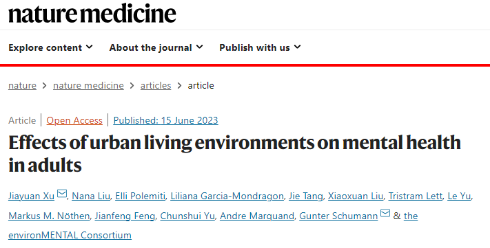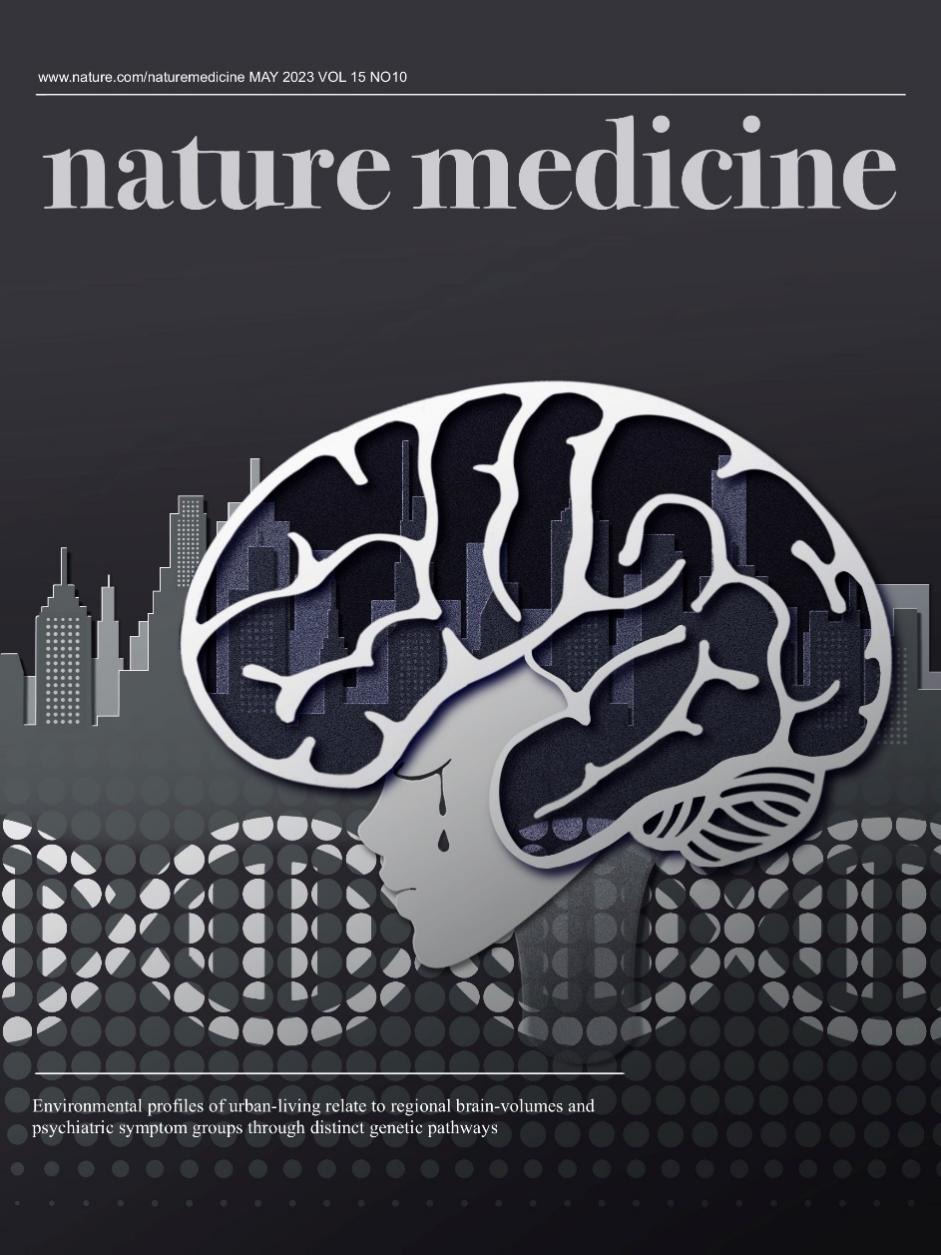 2023年6月15日,相关研究成果以《城市生活环境对成年人心理健康的影响》(“Effects of urban living environments on mental health in adults”)为题,并作为6月刊候选封面推荐论文,发表在《自然》杂志子刊《自然·医学》(Nature Medicine)。NatureMedicine编辑团队邀请该领域专家对该成果进行专篇新闻与评论报道,题为“Urban living and mental health”(图三)。该研究表明,不同的城市生活环境模块可能通过不同的神经生物学途径影响特定的精神症状群。依据人群的不同基因分型,量化每种环境因素对大脑和精神症状的影响及其在城市生活环境中的相互作用,可能有助于精准优化未来公共卫生干预措施的顺序和目标。
