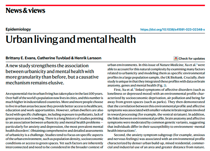 “这项研究考虑到城市环境的内在复杂性,在解读城市生活环境与精神健康之间的关联迈出了至关重要的一步!研究者观察到不同的城市环境模块影响不同的精神症状群,这一发现更加清晰地表明需要全面模拟更广泛的城市环境,包括物理和社会等方面。此外,研究者进一步提供了城市环境与精神症状之间模块化关联的确凿的神经机制,为后续研究提供了重要方向。最后,研究者表明,暴露于相同的城市环境模块的被试,并不会引起统一的情绪症状反应,而是表现出个体差异,其中遗传变异是一个重要来源。”瑞典厄勒布鲁大学Brittany E. Evans, Catherine Tuvblad和 Henrik Larsson教授接受Nature Medicine编辑团队邀请对该成果进行专篇新闻与评论报道。