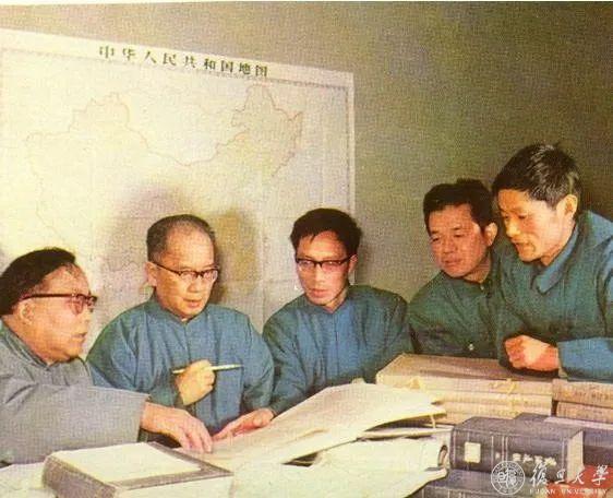 1970年代后期,谭其骧与历史地理研究室同事研究《中国历史地图集》修订(左起吴应寿、谭其骧、邹逸麟、王文楚、周维衍)