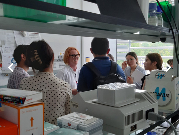 第三站是海德堡,负责老师带领同学们参观了德国癌症研究中心。德国癌症研究中心(Deutsches Krebsforschungszentrum,DKFZ)成立于1964年,坐落于巴登符腾堡州海德堡大学内。德国癌症研究中心设有6个科研领域,包括:细胞生物学和肿瘤生物学、功能和结构基因组学、癌症危险因素和预防、免疫学和癌症、影像学和放射肿瘤学、感染、炎症和癌症。德国癌症研究中心的90多个课题组致力于研究癌症的发生、发展、癌症的风险因素,并取得了多项突破性成就。2008年,Harald zur Hausen教授因发现子宫颈癌是由人乳头状瘤病毒(HPV)感染所诱发机制而获得诺贝尔生理医学奖。代表团参观了中心实验室,并对肿瘤疫苗以及CRISPR-Cas9等疗法有了更深入的了解。