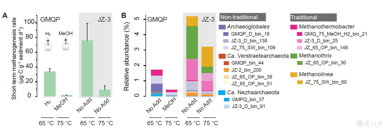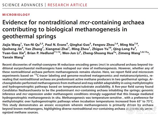 近日,复旦大学环境科学与工程系水土界面过程团队在该领域取得新突破。团队负责人王梓萌教授与中国科学技术大学环境系花正双教授组建跨学科攻关团队,联合中国地质大学(武汉)王焰新院士,以及中山大学李文均教授、俄勒冈大学金曲生教授等国内外团队,利用滇藏热泉为研究窗口,在新型产甲烷古菌的生物地球化学活性与功能的研究中取得重要进展。研究首次用实验证明了非传统型产甲烷古菌是活跃在高温热泉中甲烷的主要生产者,推进了对微生物产甲烷过程的更深层次理解。研究成果以“Evidence for non-traditional mcr-containing archaea contributing to biological methanogenesis in geothermal springs”为题,于2023年6月28日发表于《科学进展》(Science Advances)期刊。
