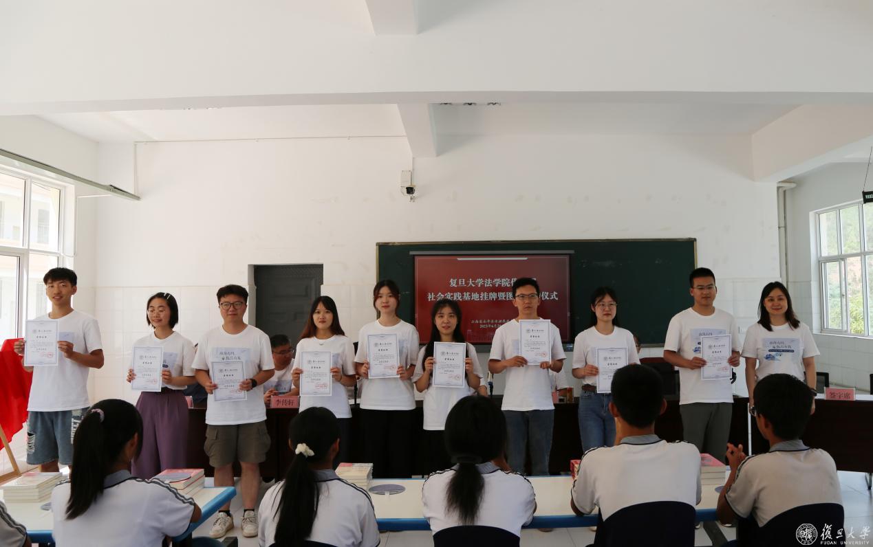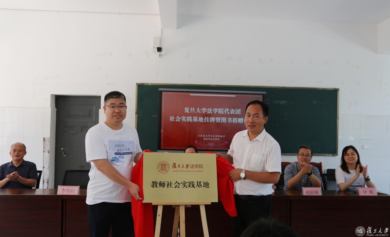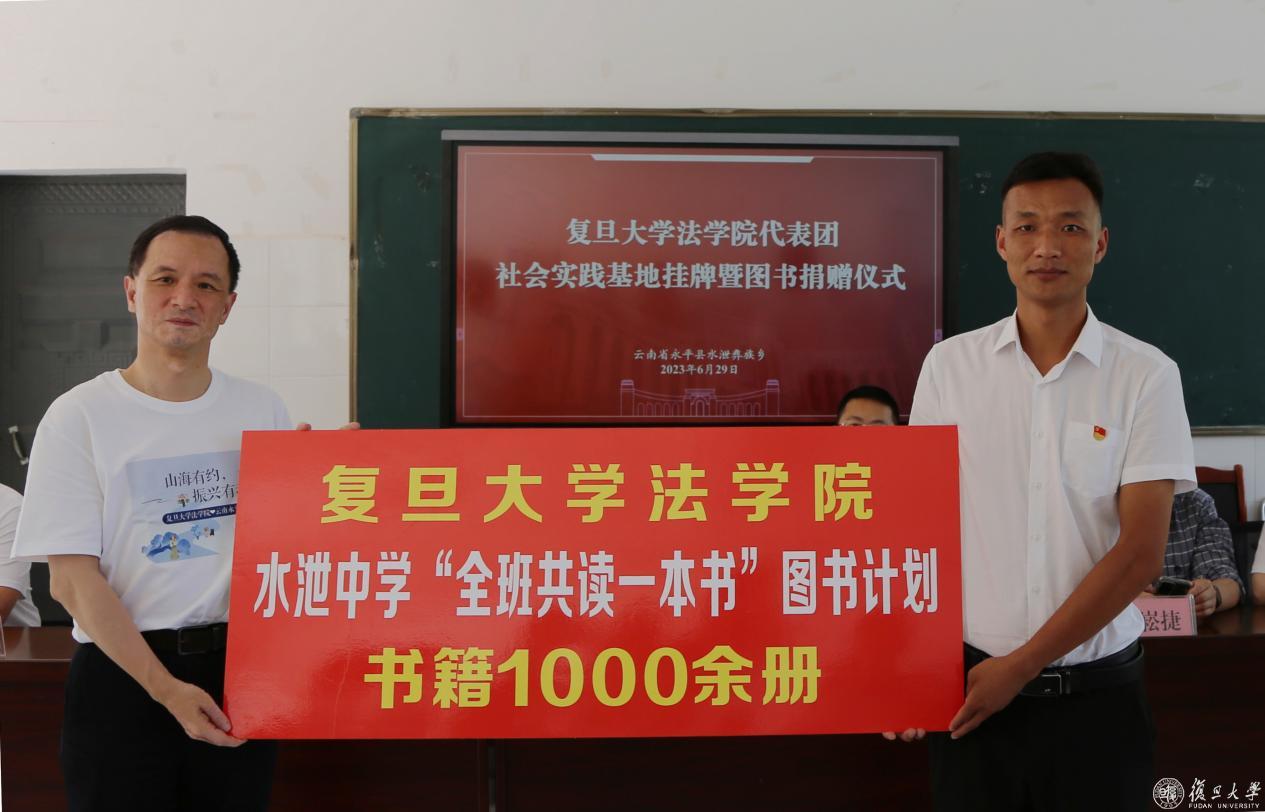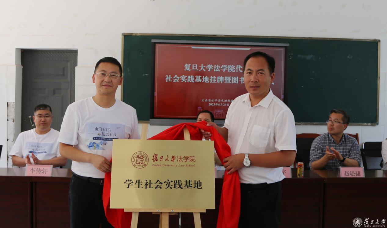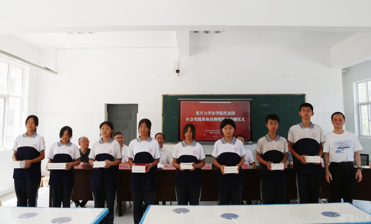 当天下午,复旦大学法学院社会实践基地挂牌暨图书捐赠仪式在水泄中学举行。仪式由水泄乡党委书记穆义华主持,王志强、副院长杜宇、党委副书记李传轩、党委副书记钟妮、院长助理王琳及十余位青年骨干教师参加。