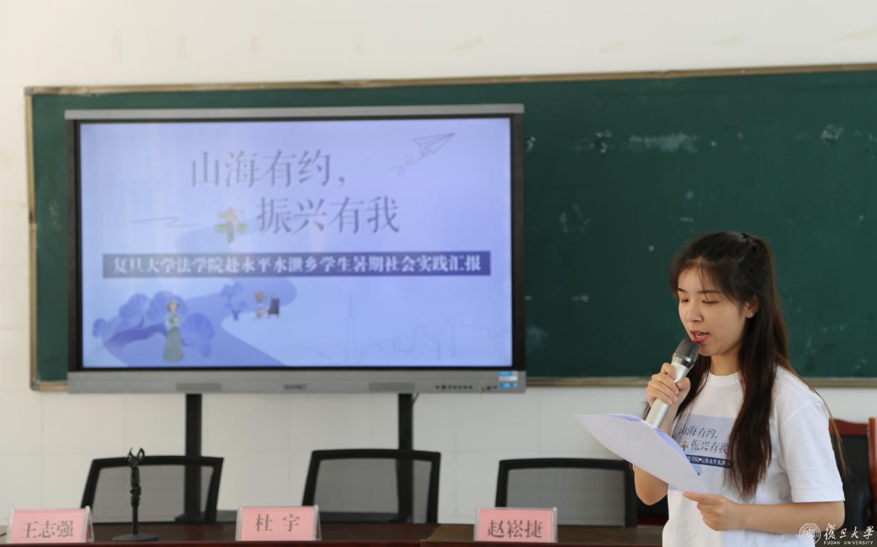 仪式上,由三十名本科生、研究生组成的学生社会暑期社会实践队分普法、挂职、支教、调研四组进行总结汇报,分享本次实践学习的心得体会。钟妮为实践队员颁发优秀志愿者证书。