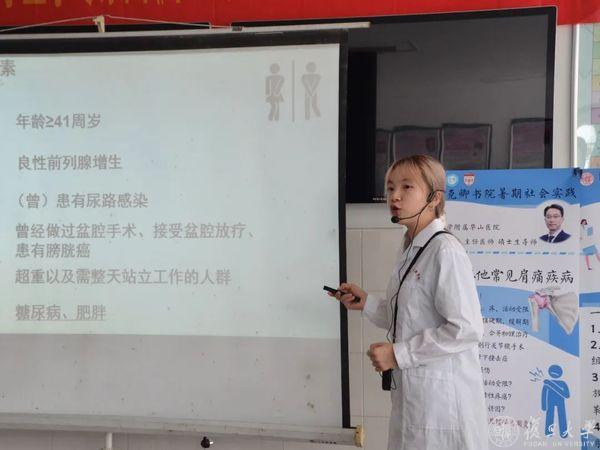 此次医疗科普社会实践活动由复旦大学克卿书院仲英青年学者、复旦大学附属华山医院泌尿外科副主任医师熊祖泉组织开展,是一门面向全体复旦学生的“行知课程”。实践团队由来自复旦大学附属中山医院、复旦大学附属华山医院、复旦大学附属肿瘤医院、复旦大学生附属儿科医院和复旦大学附属妇产科医院的10名临床专家,2名克卿书院带队老师,1名学生领队和20名复旦大学本科生组成,先后在霍山县医院、舒城县人民医院、霍邱县第一人民医院、金寨县人民医院开展实践活动。