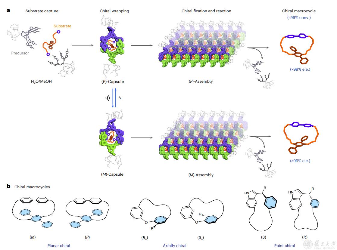 2023年7月4日,《自然·合成》(Nature Synthesis)杂志以“Enantiocontrolled macrocyclization by encapsulation of substrates in chiral capsules”为题,在线发表了复旦大学化学系李明洙教授/孙默青年研究员团队的最新成果。该研究利用超分子化学的底物诱导自组装的概念和非共价键的动态特性,调控手性自组装过程,可以合成任一想要的对映异构体,实现手性大环化合物的精准构筑。同时,Nature Synthesis还以“Chiral macrocycle formation within chiral capsules”为题发表Research Briefing文章,重点介绍课题的研究背景、意义和背后故事。