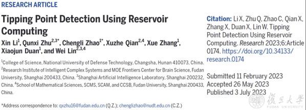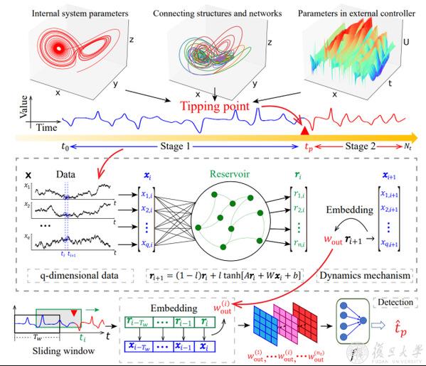 7月3日,复旦大学智能复杂体系基础理论与关键技术实验室林伟教授、朱群喜博士课题组与国防科技大学赵城利副教授的课题组合作报道了一种基于储备池计算的复杂动力系统关键临界点检测框架。该方法展现出高效且鲁棒的关键临界点检测效果,可以更好地理解和预测复杂动力系统行为。相关成果以“Tipping points detection using reservoir computing”为题发表在Research上。