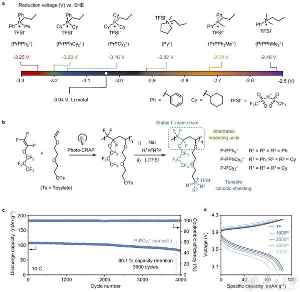 近日,复旦大学高分子科学系、聚合物分子工程国家重点实验室的PolyMao(陈茂)课题组结合本团队发展的光催化含氟烯烃可控共聚策略,设计合成了一种富含?阳离子的氟聚合物材料。在该新结构的氟聚合物中,全氟烯基醚单元与?阳离子单元呈交替序列分布,材料具有耐还原性强(-3.31 V vs SHE)、理化性能稳定、柔韧性好、耐溶剂等突出性能优势,并能通过化学结构中均匀分布的正电荷为电池负极提供优异的静电屏蔽作用。该涂层材料有力促进了充电过程中的均匀锂沉积,有效抑制了锂枝晶生长,实现了10 C倍率下3900次的锂金属电池充放电循环。