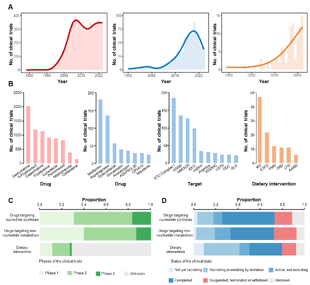靶向核苷酸代谢的治疗开始最早、发展最成熟,每年约有400项相关临床研究登记。但值得注意的是,靶向核苷酸代谢多与其它疗法联合应用。本世纪起,研究非核苷酸代谢药物的临床试验显著增加,以靶向电子传递链复合体、IDO1、突变型IDH1的药物为主。饮食干预的临床试验相对较少,且设计相对粗放,难以精细化管理。总体来看,除核苷酸代谢药物、天冬酰胺酶和IDH抑制剂以外,其他靶向代谢的治疗多处于起步阶段,并未达到理想的治疗效果。