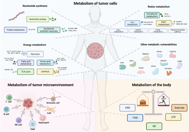 目前肿瘤代谢靶点主要可分为三个方面:靶向肿瘤细胞、靶向肿瘤微环境以及调节全身代谢。靶向肿瘤细胞的代谢脆弱性靶点的研究最多,主要涉及核苷酸合成、能量代谢、氧化还原代谢等代谢通路。其中,靶向核苷酸合成的药物最为成熟,已经广泛应用于多种肿瘤的临床治疗。能量代谢和氧化还原代谢是近年研究的热点,多个关键代谢酶如突变型IDH、GPX4、NAMPT等的抑制剂表现出良好的抗肿瘤效果。通过靶向调节微环境细胞的代谢也可以有效促进抗肿瘤免疫,影响肿瘤的增殖转移。调节全身代谢则可通过重塑肿瘤局部微生态影响肿瘤进展。