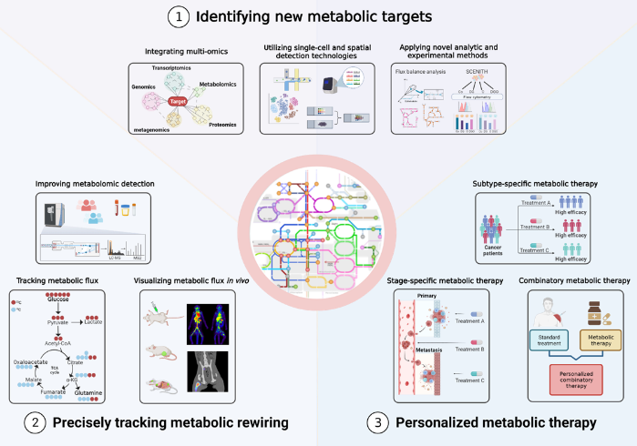 未来,提高代谢治疗疗效的方法主要包括三个层面:更全面地鉴定重要的代谢靶点,更精准地追踪肿瘤代谢重编程和更个性化地开展代谢治疗。整合多组学分析将肿瘤的代谢改变与肿瘤的遗传特征联系,有助于鉴定发挥关键作用的代谢靶点。单细胞测序和空间组学也为精准识别肿瘤微环境的代谢重编程靶点提供了可能性。对肿瘤代谢的动态跟踪可以及时识别肿瘤的代谢适应性改变,快速血浆代谢组学检测及体内代谢通量可视化是未来可能的应用模式。考虑到肿瘤的代谢异质性,精准化和个性化也是代谢治疗的重要发展方向。建立不同代谢类型肿瘤的针对性治疗策略,根据肿瘤的代谢适应情况动态调整,同时结合有效的联合治疗策略,可能是未来肿瘤代谢疗法的前进方向。