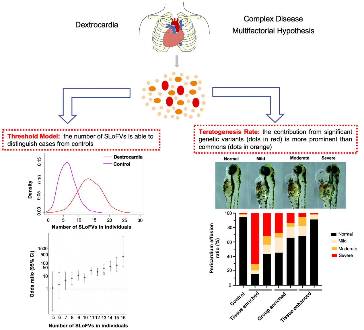 复杂疾病右位心的多因素遗传模式图。“单例功能丧失性变异”(SLoFV)在右位心中富集;当个体累积的SLoFV总数超过8个时,患右位心的风险显著高于正常人群;随着SLoFV位点总数增加,个体患右位心的风险呈指数增长;心脏特异性高表达基因的致畸率显著高于其它类型基因。