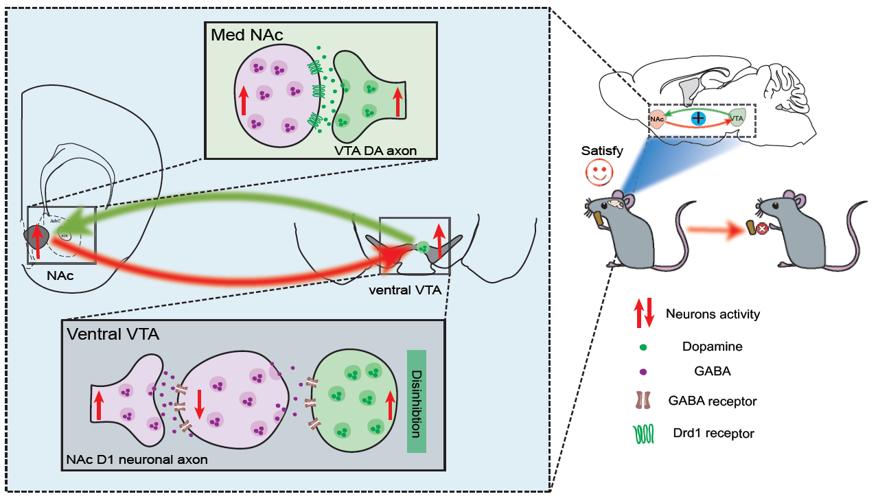 该研究利用化学遗传学、光遗传学、cFos免疫标记、神经环路示踪和电生理记录等实验方法,发现位于VTA腹侧的多巴胺神经元通过投射到内侧伏隔核(medial NAc)抑制饥饿引起的小鼠进食行为。而且,接收VTA多巴胺细胞输入的伏隔核神经元又可以投射回VTA脑区,去抑制腹侧VTA的多巴胺神经元,形成VTA→medial NAc→VTA多巴胺闭合环路来抑制饥饿进食行为。进一步利用光遗传学和实时位置偏好行为实验,研究人员发现激活腹侧VTA多巴胺神经元以及与NAc形成的神经环路可以引起正性效价,这可以补偿饥饿所引起的进食行为。该研究成果不仅揭示了VTA多巴胺神经元调控进食的神经环路机制,也提出通过提升多巴胺信号的正性效价来减轻体重的可能性。
