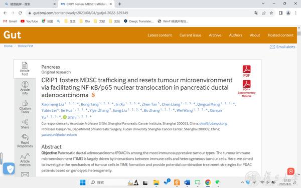 2023年8月4日,复旦大学附属肿瘤医院虞先濬/施思教授团队在国际权威学术期刊GUT上在线发表题为CRIP1 fosters MDSC trafficking and resets tumour microenvironment via facilitating NF-κB/p65 nuclear translocation in pancreatic ductal adenocarcinoma 的研究。该研究发现富含半胱氨酸蛋白1(CRIP1)可以促进骨髓来源的抑制性细胞(MDSC)在胰腺导管腺癌(PDAC)中的浸润,抑制抗肿瘤免疫的激活,联合使用CXCR1/2抑制剂可以增强高表达CRIP1胰腺癌的抗PD-L1疗效,为胰腺癌患者的精准免疫治疗提供了理论依据。