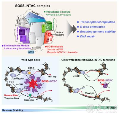 2023年8月9日,复旦大学生物医学研究院陈飞课题组与浙江大学陆华松课题组合作,在Nature期刊以长文形式发表了文章“R-loop dependent promoter-proximal termination ensures genome stability” (《R-loop依赖的启动子近端转录早期终止维持基因组稳定性》)。该研究首次发现了INTAC复合物与单链DNA识别复合物SOSS稳定结合并形成SOSS-INTAC复合物;该复合物以凝聚体的形式通过调控细胞内R-loop的水平维持基因组稳定性。该研究论文首次鉴定了一个基因转录和基因组稳定性调控复合物SOSS-INTAC,并揭示了其在基因转录调控和基因组稳定性维持中的“双重质控”功能,是基因转录与基因组稳定性交叉研究领域的又一突破性发现。