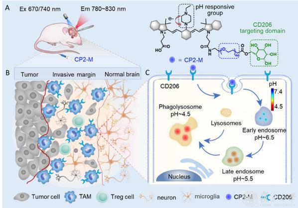 近日,复旦大学药学院李聪教授课题组提出可视化免疫抑制巨噬细胞定位胶质瘤浸润边界新策略,相关工作以“Intra-operative Definition of Glioma Infiltrative Margins by Visualizing Immunosuppressive Tumor Associated Macrophages”为题,在线发表于《先进科学》(Advanced Science)杂志。团队通过可视化免疫抑制肿瘤相关巨噬细胞定位脑胶质瘤边界。探针CP2-M通过分层靶向策略首先靶向免疫抑制巨噬细胞过度表达的CD206受体,探针经CD206受体介导内吞后在细胞吞噬小体酸性微环境中被激活,实现免疫抑制巨噬细胞的准确定位。