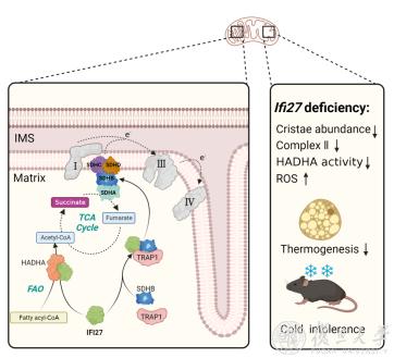 2023年8月7日,复旦大学代谢分子医学教育部重点实验室/基础医学院生物化学与分子生物学系潘东宁团队在Advanced Science上在线发表了题为“IFI27 integrates succinate and fatty acid oxidation to promote adipocyte thermogenic adaption”的研究论文。该研究揭示了线粒体蛋白IFI27在维持正常嵴形态中发挥重要作用。IFI27是线粒体代谢和适应性产热的一种新的调节因子,一方面它能够靶向调节SDHB稳定性从而维持琥珀酸脱氢酶正常功能,另一方面它直接结合脂肪酸β-氧化酶HADHA而保持其活性,IFI27的存在保证了棕色脂肪细胞内三羧酸循环和脂肪酸氧化正常运行,从而维持适应性产热。