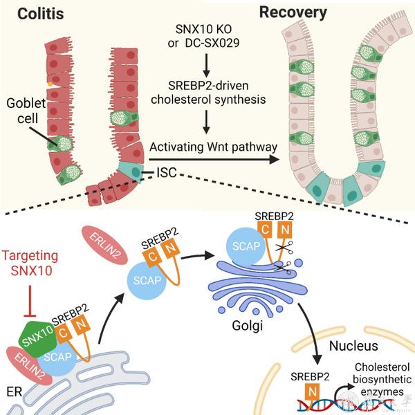 近日,复旦大学药学院沈晓燕授课题组发现治疗IBD的新型潜在药物靶点分选连接蛋白10(SNX10),干预该靶点能够通过促进胆固醇合成恢复ISC干性,从而促进IBD模型小鼠的肠上皮修复,改善病情。相关工作以“Inhibiting sorting nexin 10 promotes mucosal healing through SREBP2-mediated stemness restoration of intestinal stem cells”为题于8月30日在线发表于《科学进展》(Science Advances)杂志。该研究成果表明靶向干预SNX10或其他参与SREBP2活化或胆固醇代谢轴的调控因子有可能成为实现IBD黏膜愈合的新途径。