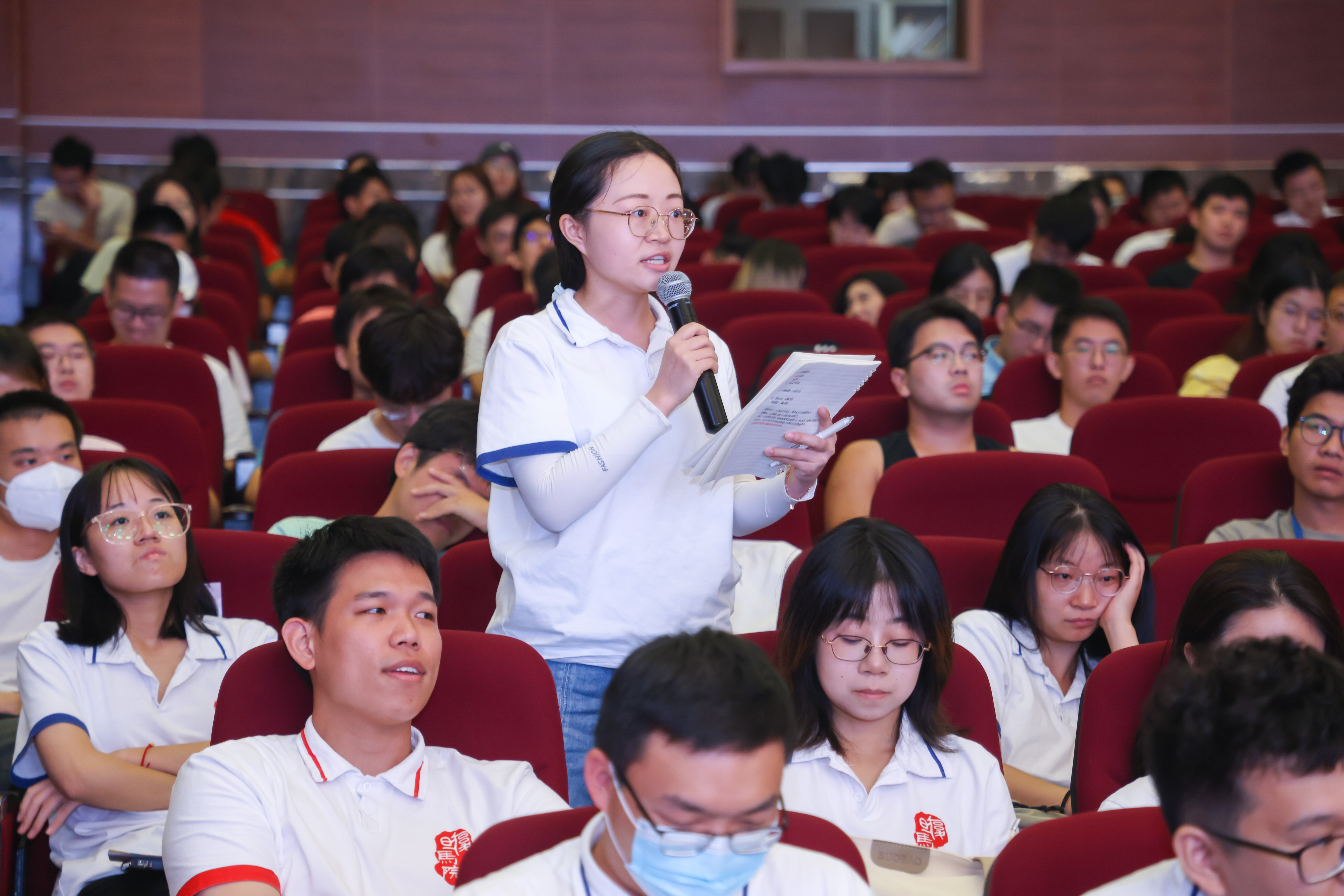 陈建峰以“为什么要上大学”以及大学生应该“做什么”和“如何做”的问题引入,强调了大学生,尤其是复旦大学的研究生,要坚持面向世界科技前沿、面向经济主战场、面向国家重大需求、面向人民生命健康科技创新,心怀祖国,承担起强国一代的使命和责任。