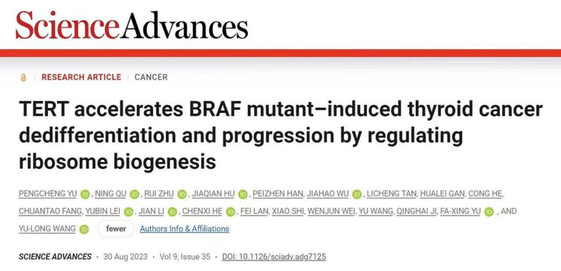 甲状腺癌是最常见的内分泌系统恶性肿瘤。尽管大多数甲状腺癌为分化较好的乳头状癌,但仍有部分为恶性程度和致死率极高的低分化及未分化甲状腺癌。2023年8月30日,复旦大学附属肿瘤医院头颈外科王玉龙主任医师与复旦大学生物医学研究院暨复旦大学附属儿科医院余发星教授合作于国际权威学术杂志Science子刊Science Advances在线发表研究论文。该研究成功鉴定出端粒酶逆转录酶(TERT)通过核糖体生物合成途径(非经典端粒酶逆转录酶活性)促进甲状腺癌进展的机制,并发现靶向核糖体RNA转录可以有效抑制甲状腺肿瘤生长、同时增强TERT激活型甲状腺癌的碘摄取能力,为TERT重新激活癌种及碘治疗抵抗的TERT激活型甲状腺癌患者的治疗提供了候选策略。