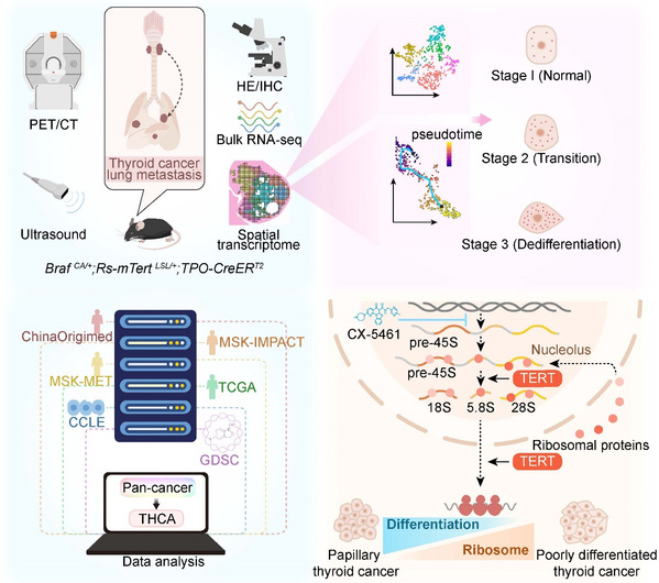 为了明确TERT促进甲状腺癌去分化的机制,研究人员对12月龄的BRAF/TERT小鼠甲状腺进行了空间转录组测序,发现其甲状腺内部具有高度的异质性,既有高表达Tg,Tpo等经典甲状腺分化标记物的细胞,也有乳头状癌及低分化癌细胞。拟时序分析和通路富集分析显示,随着端粒酶活性的升高,甲状腺分化评分逐渐降低,同时伴随着核糖体相关通路的激活。研究者通过多种数据分析及实验,发现TERT调节核糖体RNA(rRNA)的表达以及蛋白质翻译,从而驱动甲状腺癌逐步去分化。