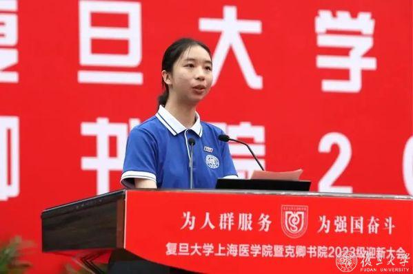 公共卫生学院2023级本科生徐博作为新生代表发言。年幼时的就医经历在徐博的心中埋下了医学梦的种子,疫情期间守卫健康的白衣战士让她意识到医务工作者的伟大。在复旦上医的这两周里,她在接踵而至的迎新活动中逐渐深入复旦、爱上复旦,深深体会到复旦大学的引领创新、开放包容。穿上克卿书院靛蓝色的书院服,徐博意识到了自己所肩负着的荣誉和责任,她勉励自己和同学们,要努力践行上医“正谊明道”的院训,在求知路上笃行不怠,为人群筑起坚实可靠的屏障,书写属于2023级复旦上医人的灿烂未来。