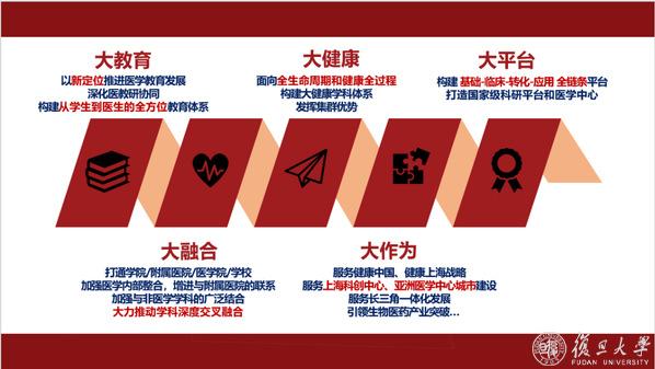 接着,屏幕上又出现了一张百年奋斗坐标图,袁正宏从党的二十大强调的“健康中国”宏伟蓝图,到“第一个复旦”之医学“八问”,向同学们介绍了上医“大教育、大健康、大平台、大融合、大作为”的发展思路,从“固优势、促整合、强支撑、立增长、亮特色”等五个方面加快建设一流医学学科,在建设“第一个复旦”过程中,责无旁贷成为“先头部队”。