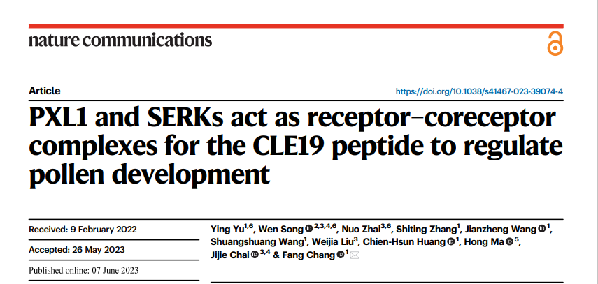 日前,复旦大学生命科学学院及遗传国重室的常芳团队联合清华大学柴继杰团队,在Nature Communications《自然通讯》,在线发表了题为“PXL1 and SERKs act as receptor-coreceptor complex for the CLE19 peptide to regulate pollen development”(PXL1和SERKs作为受体-共受体复合物介导CLE19小肽信号而调控花粉发育)的研究论文。该研究以拟南芥花药为模式系统,通过一系列实验证实了PXL1-SERKs是细胞外小肽CLE19的受体-共受体,揭示了该模块介导小孢子-花药壁体细胞间信号交流,进而维持花粉育性的分子机制。
