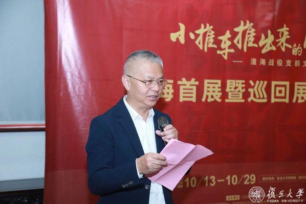 姚文中在致辞中表示,“小推车推出来的胜利——淮海战役支前文物展”作为2023年度江苏省博物馆纪念馆精品展项目之一,是江苏省持续提升文物公共文化服务的具体举措。首展走进复旦大学,是复旦大学和淮海战役纪念馆的一次馆校联动,也是推动新时代革命文物工作与高校思政教育改革创新融合发展的重要成果。将展览送进校园,旨在让广大青年学生直观了解革命历史,了解党和人民群众的血肉深情,激励青年一代树立听党话、跟党走的坚定信念,让青春在新时代新征程上绽放。