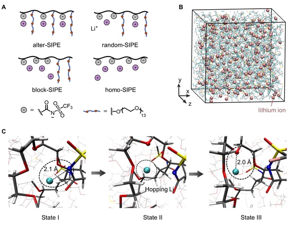 图2. A) 不同序列结构的单锂离子导电聚合物电解质示意图;B) 交替序列结构的单锂离子导电聚合物电解质的分子动力学模拟图;C) 交替序列促进锂离子连续跳跃迁移的路径示意图