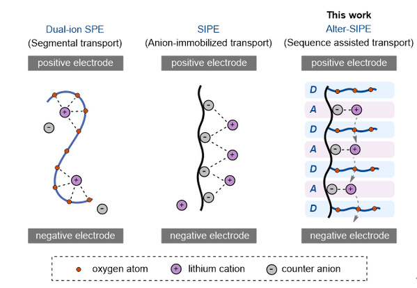 图1. 锂离子迁移机理示意图。左)基于链节运动的离子迁移模式(以电中性聚合物与锂盐混合物为例);中)基于跳跃的离子迁移模式(以单离子导电聚合物为例);右)本研究提出的交替序列促进的离子迁移新模式。