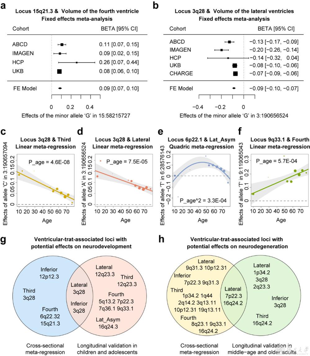 进一步,研究团队在分析中加入儿童、青少年、青年队列及纵向数据,探究遗传因素在全生命周期对脑室的影响。研究结果显示,chr3q28位点主要参与脑室发育,而chr7p22.3和chr16q24.2位点可能在脑室的老化过程发挥作用。
