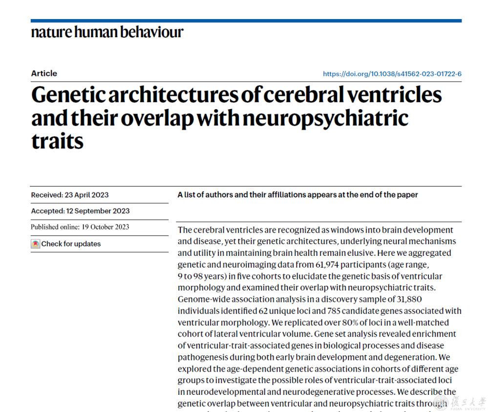 相关研究成果以《脑室的遗传结构及其与神经精神特征的遗传重叠》(“Genetic architectures of cerebral ventricles and their overlap with neuropsychiatric traits”)为题发表在Nature子刊Nature Human Behaviour。