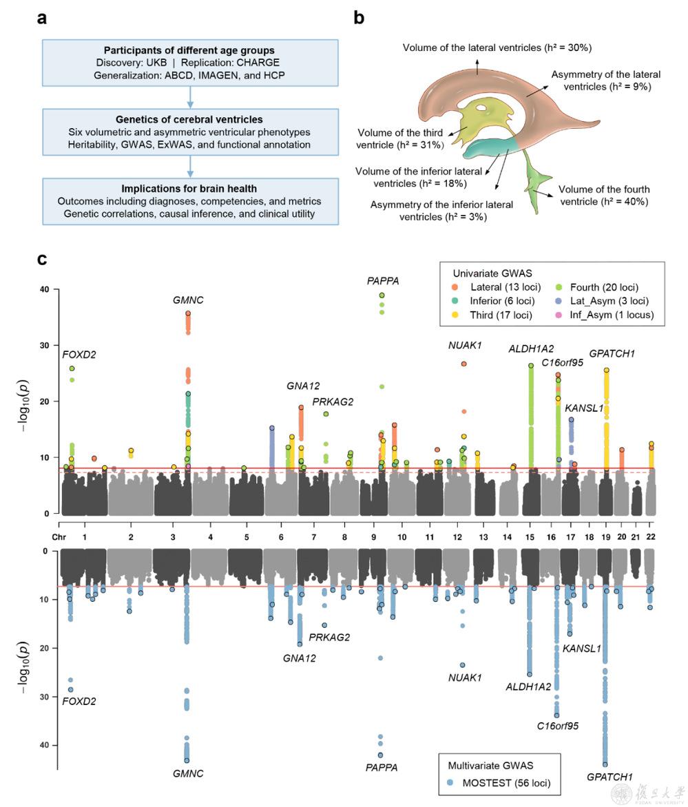 研究团队首先利用31,880位参与者的遗传和颅脑核磁共振数据,对侧脑室体积、侧脑室下角体积、第三脑室体积、第四脑室体积、侧脑室不对称性、侧脑室下角不对称性进行分析,发现了62个影响脑室形态的遗传位点和785个候选基因,并在包括23,533人的独立队列中验证了超过80%的影响侧脑室体积的位点。进一步分析提示脑室的体积及不对称性均可遗传(遗传力3%-40%),与脑室相关的基因同时在脑的发育和衰老通路中富集。