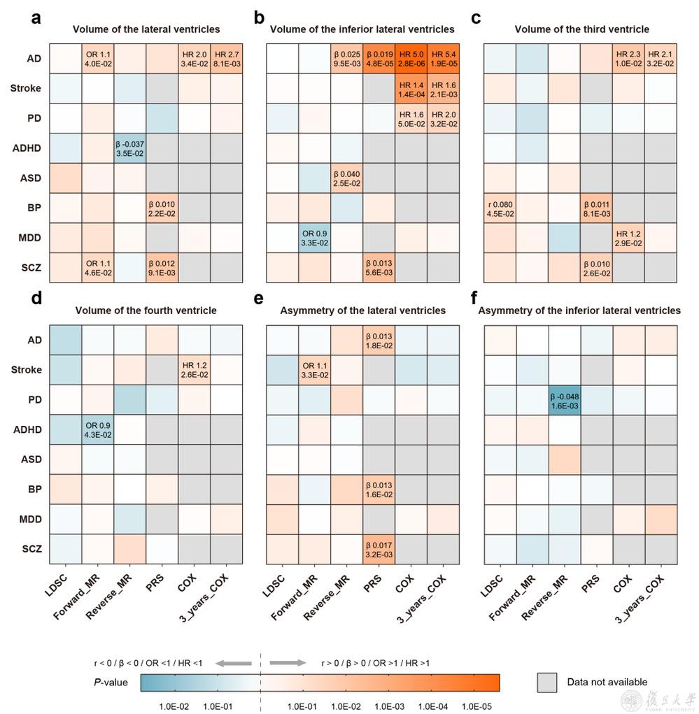 研究团队表示,对于其他神经精神疾病,各分析方法并未得到一致的结论,因此结论证据水平相对较低。而对于阿尔茨海默病,多种分析结果共同支持侧脑室下角体积与阿尔茨海默病存在正向关联,且能经过独立队列的验证,因此该结论较为稳健。