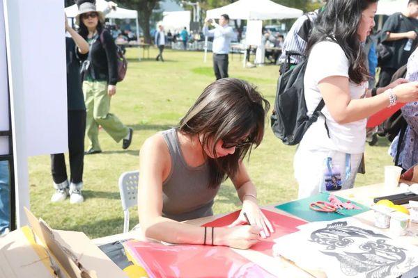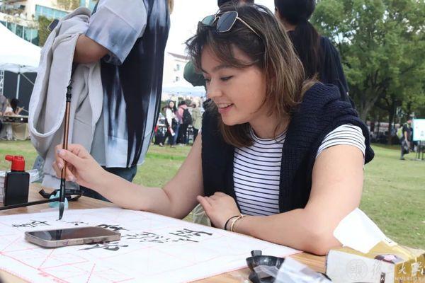 在“墨笔留香”摊位上,瑞典留学生Hedda Ek屏气凝神,小心翼翼地提笔又落笔。“这是我第一次写书法字,好难啊。”尽管担心自己写得不好,她还是尝试了复杂的繁体字“藝”,“我的中文名是‘梦艺’,能把自己的名字用毛笔写出来,我很骄傲。”