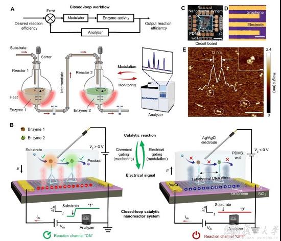 9月20日,高分子科学系、聚合物分子工程国家重点实验室魏大程课题组在 Science Advances期刊上发表题为“A Closed-loop catalytic nanoreactor system on transistor”的文章。该研究通过DNA框架结构在晶体管界面构筑了多酶级联催化纳米反应器,发现了晶体管界面处的电-化学双向场调控效应(inter-electro-chemical gating effect),实现了在分子尺度上对酶级联催化反应的实时监控和电学调控。该工作在晶体管表面构建了集纳米反应器、调节器和监测器为一体的纳米化学实验室,在纳米尺度上对多级酶联催化反应进行了闭环控制。