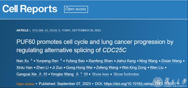 9月7日,复旦大学基础医学院王勇波课题组与南通大学医学院解刚才团队的合作研究成果以“PUF60 promotes cell cycle and lung cancer progression by regulating alternative splicing of CDC25C”在Cell Reports杂志在线发表。该研究揭示了PUF60通过可变剪接调控细胞周期促进肺癌进展的新功能与机制,为剪接异常在细胞周期进展及癌症发生发展的作用提供了新的认识。
