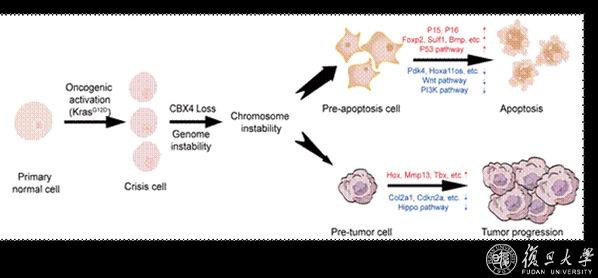 9月12日,基础医学院人体解剖与组织胚胎学系王作云和梁春敏课题组于Signal Transduction and Targeted Therapy杂志在线发表了题为“CBX4 deletion promotes tumorigenesis under KrasG12D background by inducing genomic instability”的工作。该研究揭示了PRC1家族重要成员CBX4的缺失会影响基因组稳定性,并在KrasG12D突变背景下通过调节P15,P16等凋亡相关基因的表达,使大部分细胞在初始阶段凋亡,而存活细胞的多种肿瘤相关基因和Hippo等信号通路改变,最终诱导肿瘤产生的现象。该研究提供了低CBX4水平肺癌发生的可能机制,并为精准靶向具有KrasG12D突变的癌症治疗提供了新线索。