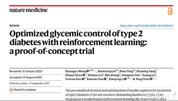 9月14日,附属中山医院内分泌科李小英、陈颖团队联合北京邮电大学王光宇教授团队在Nature Medicine在线发表研究成果——在国际上首次提出采用基于强化学习算法的AI系统“RL-DITR”制定胰岛素决策策略,有效提升2型糖尿病患者的胰岛素治疗方案准确性。该研究成果可为2型糖尿病患者提供个性化、动态的诊治方案,辅助建立分级诊疗体系,提升慢病管理效率。