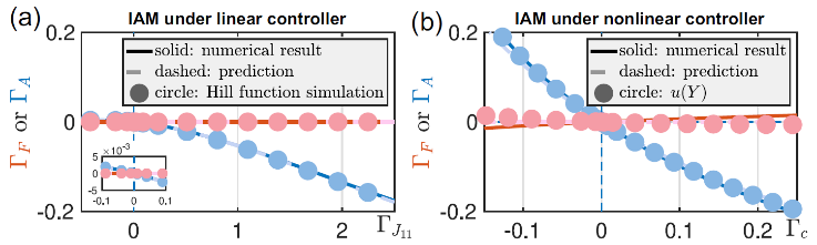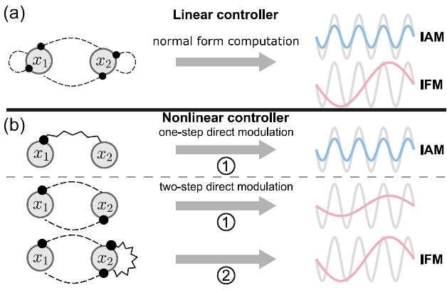 振荡在生命系统中普遍存在,例如,昼夜节律、神经元脉冲发放、心跳等。频率和振幅是生物振荡的重要表征,前者刻画了上游信号的特征,决定了下游功能是否启动,后者则调节了功能的强弱。具有适当频率和振幅的振荡对保持生命系统健康运行至关重要。异常的频率或振幅会导致节律紊乱并进一步引发诸如睡眠障碍、二型糖尿病、抑郁症等各类生理或心理疾病。此时,便需要利用系统自身的调频调幅机制或通过人工干预的方法将频率、振幅调节至正常水平。其中,如何实现单独调控频率或振幅而维持另一个量恒定不变长期以来受到来自生命科学及相关交叉领域研究人员的特别关注。数十年来,在这一方向上涌现了许多优秀的开创性工作。有学者揭示了频率可调性与生物振荡系统反馈回路模式之间的关联;也有学者利用数学模型列举了针对特定系统少数可行的调频调幅控制器,并被其他学者通过生物学实验得到验证;同期,也有研究者提出了生物振荡的线性反馈调控方法与理论。这些工作虽然成功,但是有时候需要繁琐、复杂、消耗大量资源的大规模计算,或仅针对特定系统有效。这些限制在一定程度上给实际应用带来了挑战。因此,发展一种便于理解与使用的通用调频调幅原理和控制器设计方法变得非常有理论价值和现实意义。