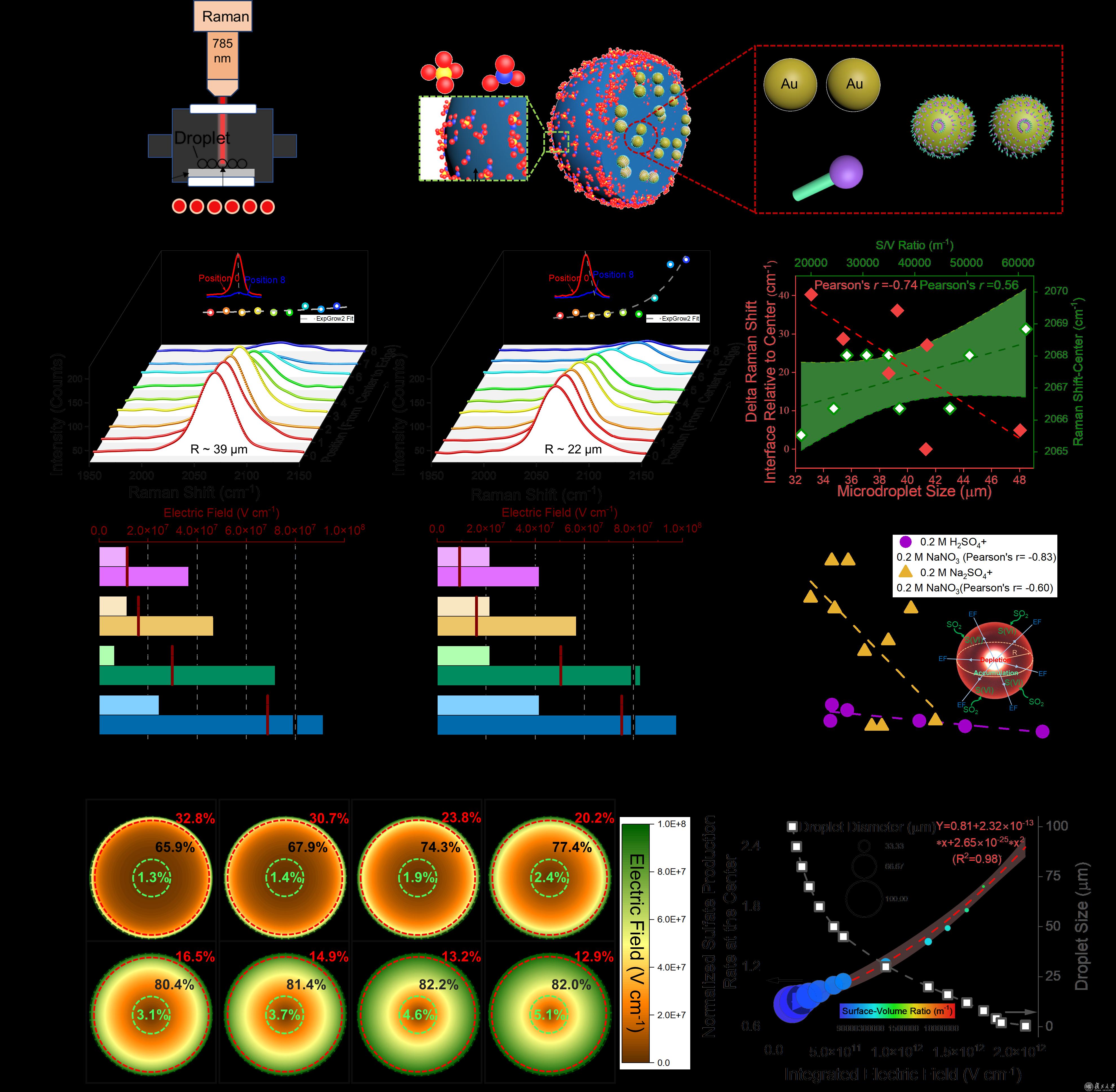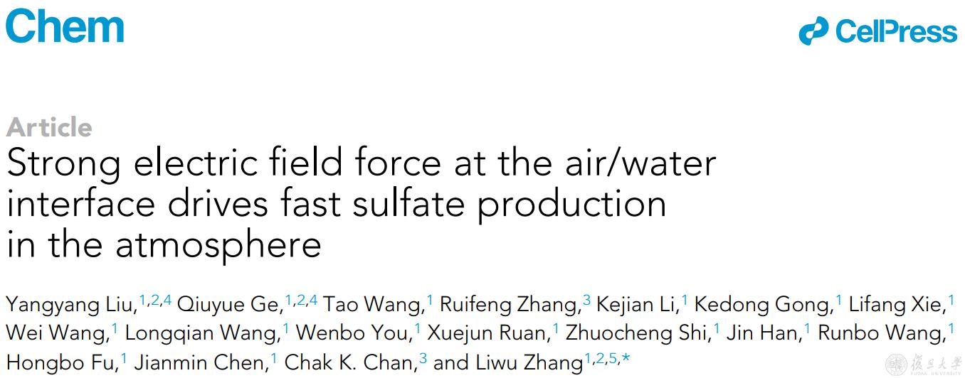 近日,复旦大学环境科学与工程系张立武团队在大气化学领域取得重要研究进展,利用共聚焦表面增强显微拉曼光谱为研究手段,在大气气溶胶气-液界面效应加快二次硫酸盐形成机制的研究中取得重大突破,通过实验室模拟,数值计算以及理论计算揭示了气溶胶气-液界面强电场是加速大气二氧化硫氧化的重要驱动力,推进了气-液界面促进大气化学过程的更深层次理解。研究成果以“Strong electric field force at the air/water interface drives fast sulfate production in the atmosphere”为题,于近日发表于Cell姊妹刊《化学》(Chem)期刊上。