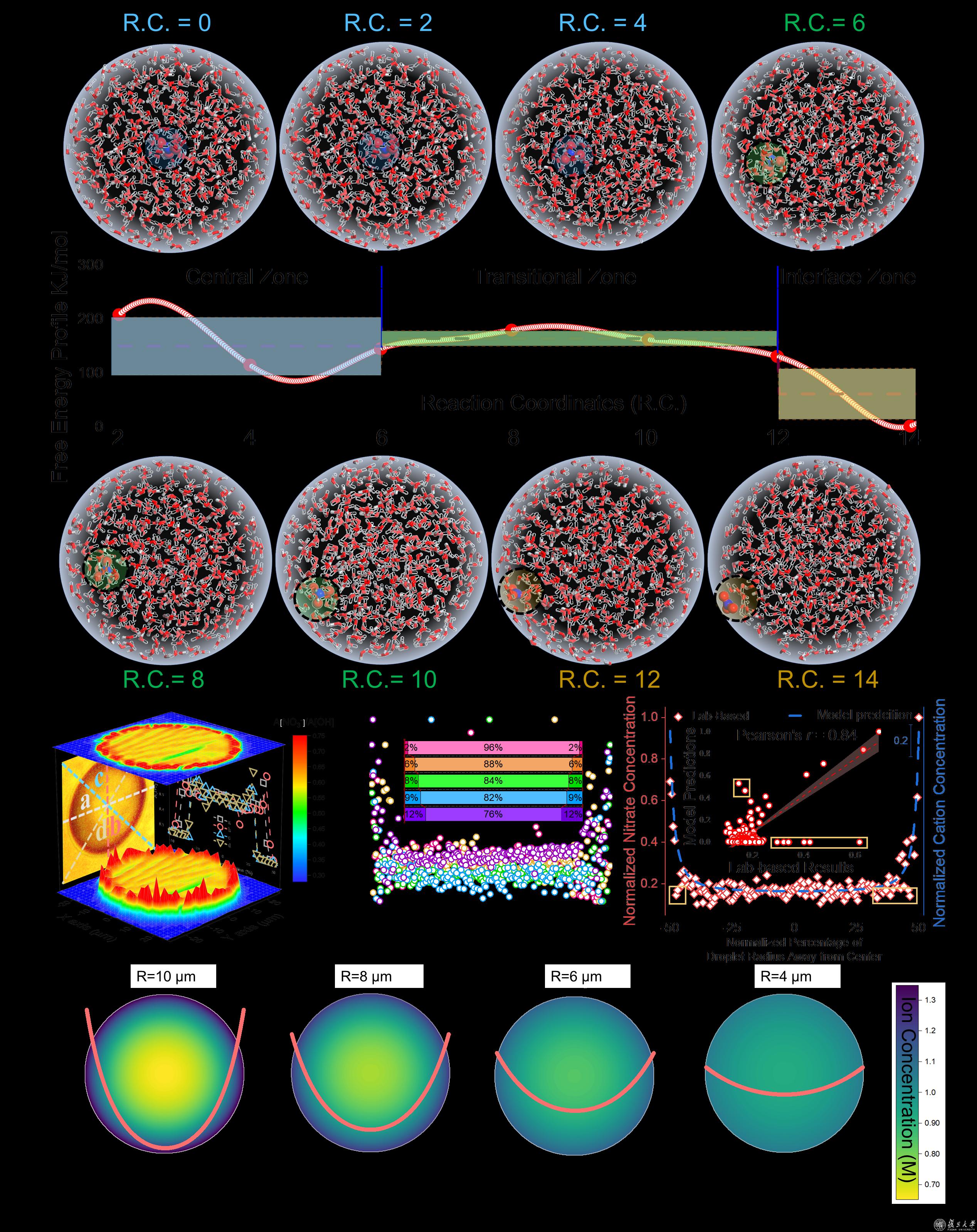 硝酸盐气溶胶微滴阴离子表面倾向的理论和实验证据。(A)气溶胶微滴中NO3-表面倾向的MD模拟。(B) NO3-在直径为~50 μm的NaNO3微滴赤道截面上的二维分布。(C)不同S/V下NO3-([A NO3-]/A[OH])归一化浓度。(D)硝酸盐浓度的实验室观测与模型预测之间的线性拟合。(E)通过二维电场建模得到离子浓度空间分布的投影图和相应的等高线图。