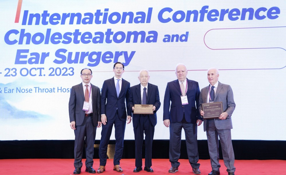 耳科医疗水平的快速发展,凝聚了国内外广大耳科前辈们的心血与智慧。王正敏院士和Maria Sanna教授在耳外科、颅底外科领域做出了世界级的贡献,得到了国内外耳科学界高度褒扬。CHOLE前任主席Nuri Özgirgin教授及新当选主席的Robert Jan Pauw教授一同为他们授予了终身成就奖。