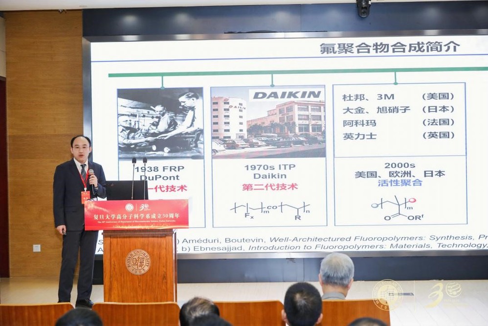 在青年骨干教师报告会阶段,复旦大学高分子科学系教授陈茂带来以“含氟聚合物精准合成”为题的报告,系学术界校友代表、中国科学院上海有机所研究员黄晓宇担任嘉宾主持。陈茂重点介绍了研究团队提出的利用光催化机理实现含氟聚合物精准合成的新策略,以及可见光催化含氟烯烃活性自由基聚合的新体系,揭示了新结构含氟聚合物在促进锂离子传导方面的新机制。