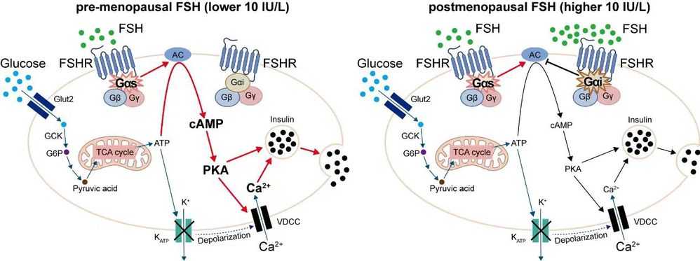 综上,该研究首次报道了在人和小鼠胰岛β细胞中表达FSHR,FSH结合FSHR,通过cAMP-PKA和胞内钙信号,调控葡萄糖刺激胰岛素分泌。因不同浓度FSH结合FSHR后,偶联激活的G蛋白亚基不同(Gαs和Gαi),使FSH对胰岛素分泌的调控呈“钟型曲线”改变。该研究提出的FSH/FSHR-Gαs/Gαi-cAMP-PKA和胞内钙信号这一功能轴不仅阐明了FSH调控GSIS的分子机制,也为绝经后糖尿病临床研究和治疗策略提供了新视角和途径。